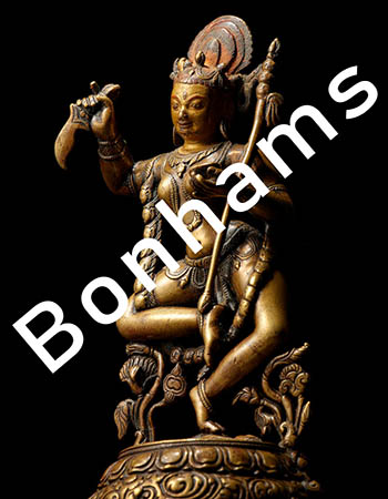 Cette vente comprend près d’une vingtaine de pièces d’art himalayen et tibétain. Parmi les statues bouddhiques en métal, on peut signaler la présence d’une statue remarquable de Vajrarahi (lot 305) provenant de la collection Nyingjei Lam et d’une statue népalaise de Lokeshvara (lot 309). La vente comprend également une statue en argile de Shabdrung Ngagwang Namgyal (lot 303) et un thangka (lot 312) du mandala d’Ushnishavijaya appartenant à la série de Ngor (15e siècle).
